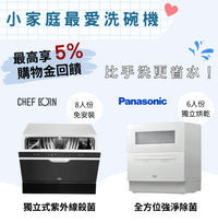 韓國熱賣!獨家UV紫外線8人份免安裝獨立式桌上型洗碗機 採用加熱烘乾及自動開門設計,不會有其他品牌採用餘溫烘乾方式導致碗盤烘不乾的缺點,依照實際擺放位置需求,鑽孔安裝或免安裝皆可,適合租屋族及小家庭使用。 UV紫外線、75度高溫雙重消毒 加熱熱風烘乾,搭配自動開門設計 獨立免安裝、鑽孔皆可,租屋或廚下都適用 可洗蔬果、奶瓶 總代理公司貨,享一年保固 🎁 安庭獨家送: 水果籃 10L折疊水桶 淨森林環保洗碗粉1.2kg 1包 (市值$480) ⚠️ 洗劑將與洗碗機分箱到貨 💡常見問題 Q1:剛打開是洗碗機內部會殘留水份是為什麼?A1:組裝後,出廠前會對每台洗碗機進行洗滌測試,驗收過程後會殘留水份皆屬正常。 已經進行洗滌測試的機台,側面都會貼有QCPASSED貼紙。 Q2:可以連接自來水管嗎?A2:該洗碗機除了免安裝設置方式外,也可以用供水管直接連接自來水管來使用。 安裝方式&影片請點此 Q3:洗滌完之後會有轉動的聲音是為什麼?A3:洗滌模式結束後,每4小時風扇轉動15分鐘來進行內部換氣,如果要停止換氣功能,需要關閉電源後拔掉電源插頭。 Q4:投放亮碟劑之後還是顯示不足時需要怎麼處理呢?A4:亮碟劑初次需要投放130ML以上,若量少於30ML會顯示亮碟劑不足。 Q5:利用免安裝方式進行自動吸水時,顯示缺水時需要怎麼處理?A5:請先確認吸水管是否正常連接,且需要用蓋子堵柱供水管。 Q6:熱風烘乾結束後,內部還是有水份時怎麼處理?A6:乾燥程度會根據餐具的種類、擺放位置、數量而有所差異,建議使用亮碟劑提升烘乾的效果。 商品資訊 型號:WASHFALL 8 BLACK LABEL 電壓/頻率(V/Hz):110V/60Hz 功率:750W 尺寸:寬55cm...